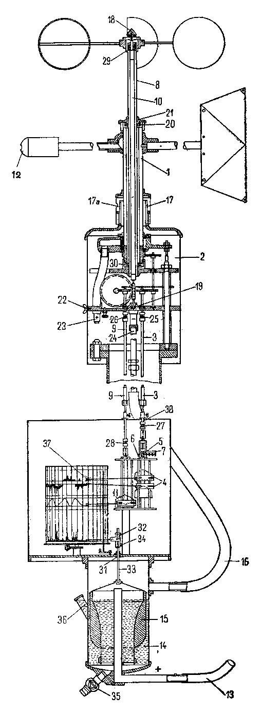Anemograf uporabljamo za zapisovanje smeri in hitrosti vetra. Pri nas se največ uporablja Fuessov univerzalni anemograf (sl. 68), ki ima priprave za zapisovanje smeri vetra, povprečne hitrosti ali opravljene poti vetra v kilometrih in trenutne hitrosti vetra v metrih na sekundo. V ta namen im asprejemni del in del za zapisovanje (registrirni del). Sprejemni del (sl. 68 in 69, zgornji del) se sestoji iz treh kombiniranih sprejemnikov: prvega za smer, drugega za povprečno hitrost (opravljeno pot) in tretjega za trenutno hitrost (pritisk vetra). Ti sprejemniki stojijo zunaj, na kakšni stavbi ali na posebnem drogu, kjer so izpostavljeni delovanju vetra. Vplivi vetra se prenašajo po posebnih prenosih do registrirnega dela. Ves sprejemni del stoji na debeli železni cevi - nosilcu anemografa. Skozi to cev so speljani prenosi, ki vežejo sprejemnik z registrirnimi napravami. Registrirni del (sl. 68, spodnji del in sl. 70) je sestavljen iz treh posebnih priprav za zapisovanje smeri, povprečne hitrosti (opravljene poti) in trenutne histrosti vetra. Te priprave se nahajajo v posebni kovinski škatli, ki stoji v zavarovanem prostoru v stavbi ali v posebni hišici. Če je prenos od sprejemnika do pisala mehaničen, se nahajajo pisala v stavbi, neposredno pod sprejemnim delom, kot je razvidno s slike 71. Shema anemografa je podana na sliki 68, kjer so s številkami označeni vsi važnejši deli. |