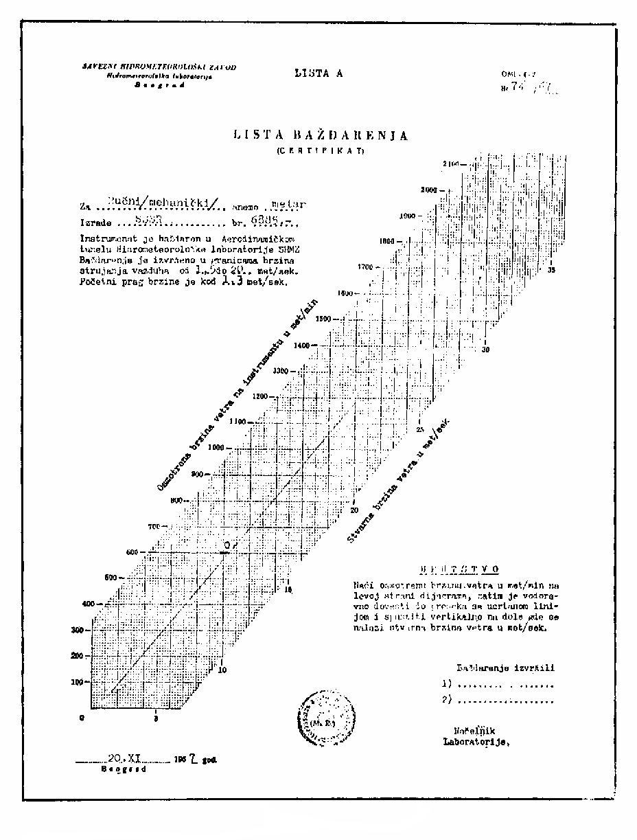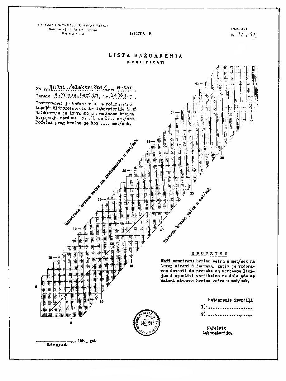 Dobljeni podatek o hitrosti vetra moramo popraviti za odgovarjajočo vrednost s krivulje na korekcijskem listu, če obstaja napaka instrumenta.