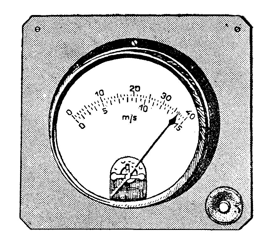 Tudi sobni indikator hitrosti (sl. 75) ima obliko ure, s kazalcem in dvema skalama za hitrost vetra v metrih na sekundo. Zgornja skala kaže hitrosti do 40 m/s in normalno je ta vključena. Spodnjo skalo uporabljamo samo s pritiskom na gumb v vogalu škatle; ta skala nam daje točnejše vrednosti pri hitrostih vetra pod 20 m/s.