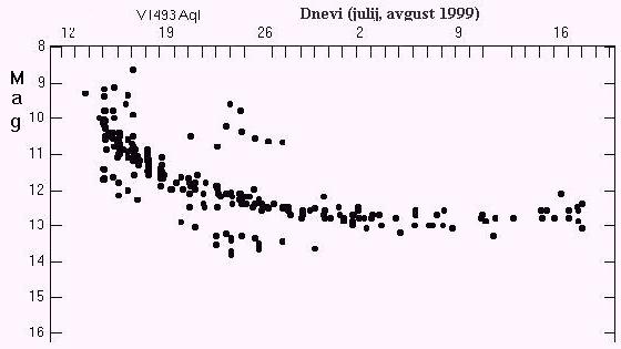 Časovni potek sija nove V1493 Aql. V dveh tednih je sij padel za 4 magnitude. Graf najdete na Internetu, http: //www.kusastro.kyoto-u.ac.jp/vsnet/etc/drawobs.cgi?text=AQLV1493