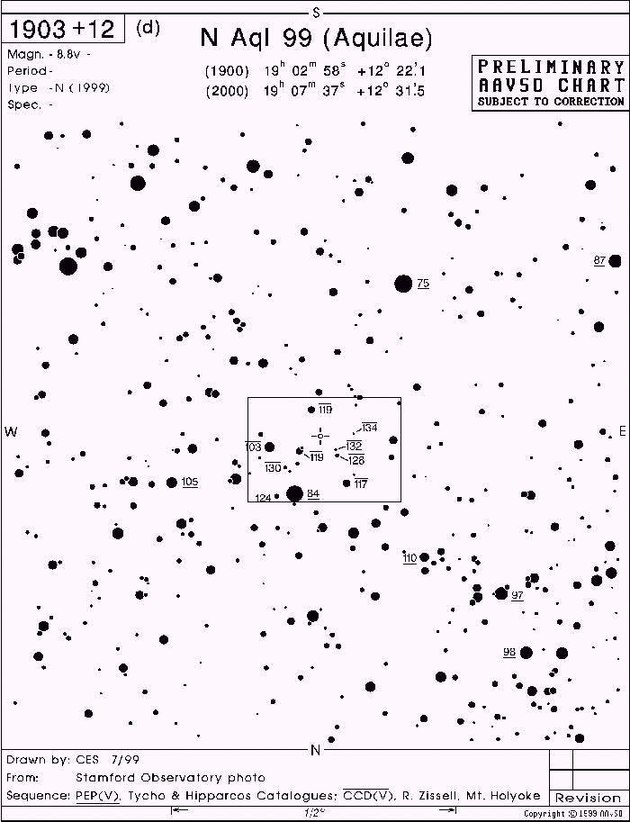 AAVSO karta okolice nove z nekaterimi zvezdami z znanim sijem, za določitev sija nove na 0,1 magnitude natančno.