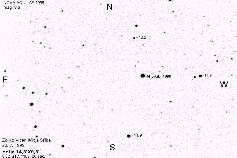 v gorišču teleskopa MEADE LX200, D=25,4 cm, f/6,3, čas osvetlitve 20 sekund. Datum: 7. december 1999, ob 19. uri. Posnel Zorko Vičar. Karte okolice nove so na strani: http://www.aavso.org/alert264.stm Koordinate so: R.A. = 19h 23m 05s.38 Decl.= +04 57' 20".1 (Equinox 2000.0), magnituda 5, 5, nova je bila torej dosegljiva že z daljnogledom. Novo je odkril Portugalec Alfredo Pereira in to z daljnogledom (14X100), za kar mu gredo vse čestitke, saj je prehitel vse avtomatske teleskope opremljene s CCD-ji.