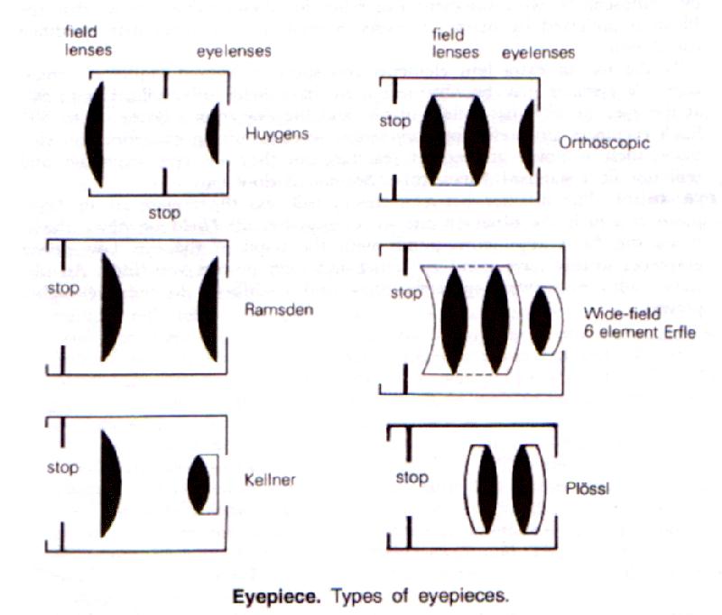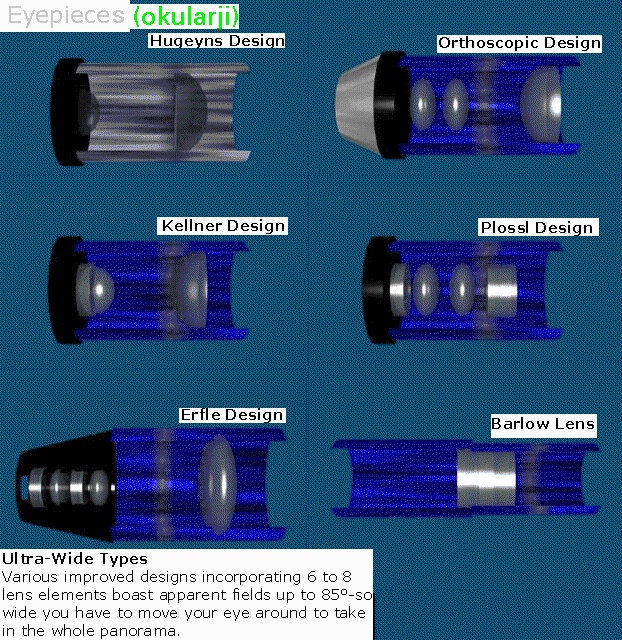 Nekateri tipi okularjev shematsko in fizični prerez.