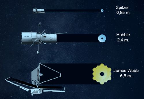 Primerjava velikosti zrcal vesoljskih teleskopov Spitzer, Hubble in James Webb.