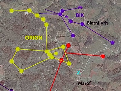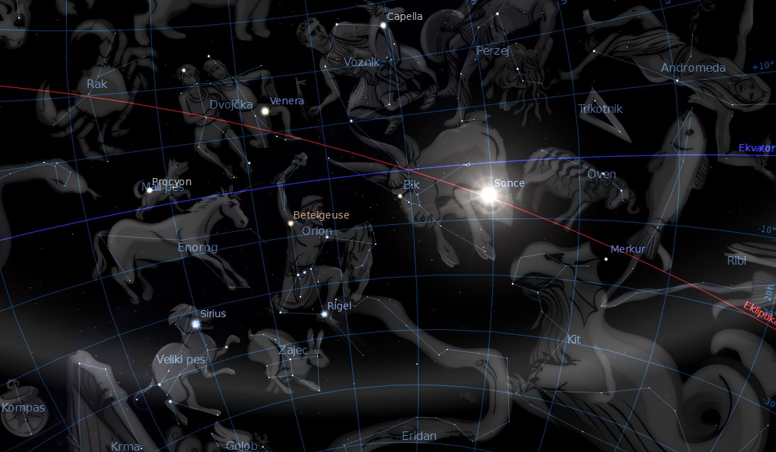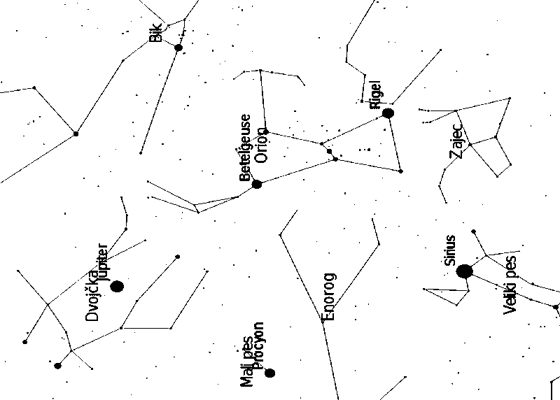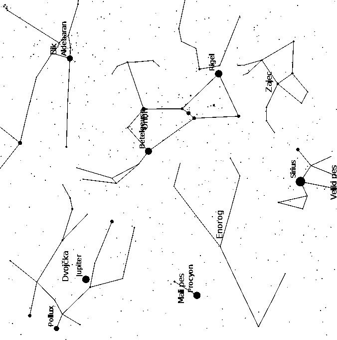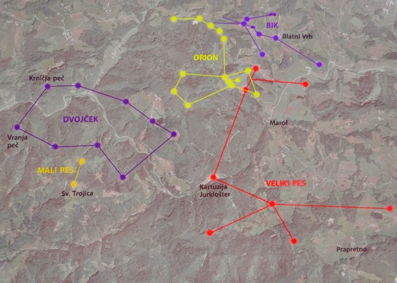 Barvna podlaga je karta dr. Karla Gržana, ČB plast je zvezdna karta (do Plejad). |