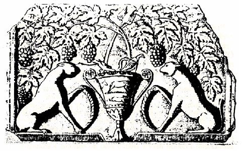 Gospa Sveta (Maria Saal): Rimski kamen nad vhodom v stolnico (2. stol.). Na njem drevo življenja, ki rase iz posode milosti. Obdajata ga panterja, ki držita v šapah rog izobilja.