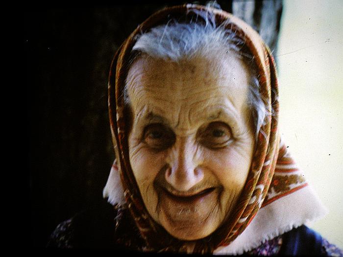 ena pijona močna škrbava teta v batčih, z robcom na glovi - pa še jo so skregali,