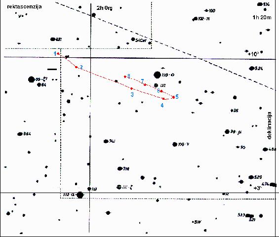 št. slike datum RA - h m s DEC-st. ' '' 1 6.8.1998 2 07 17 10 10 01 2 24.9.1998 2 02 55 9 34 39 3 5.11.1998 1 50 59 8 27 40 4 3.12.1998 1 44 11 7 54 24 5 8.1.1999 1 41 57 7 52 14 6 29.1.1999 1 44 44 8 14 28 7 12.2.1999 1 48 08 8 37 29 8 26.2.1999 1 52 35 9 05 45