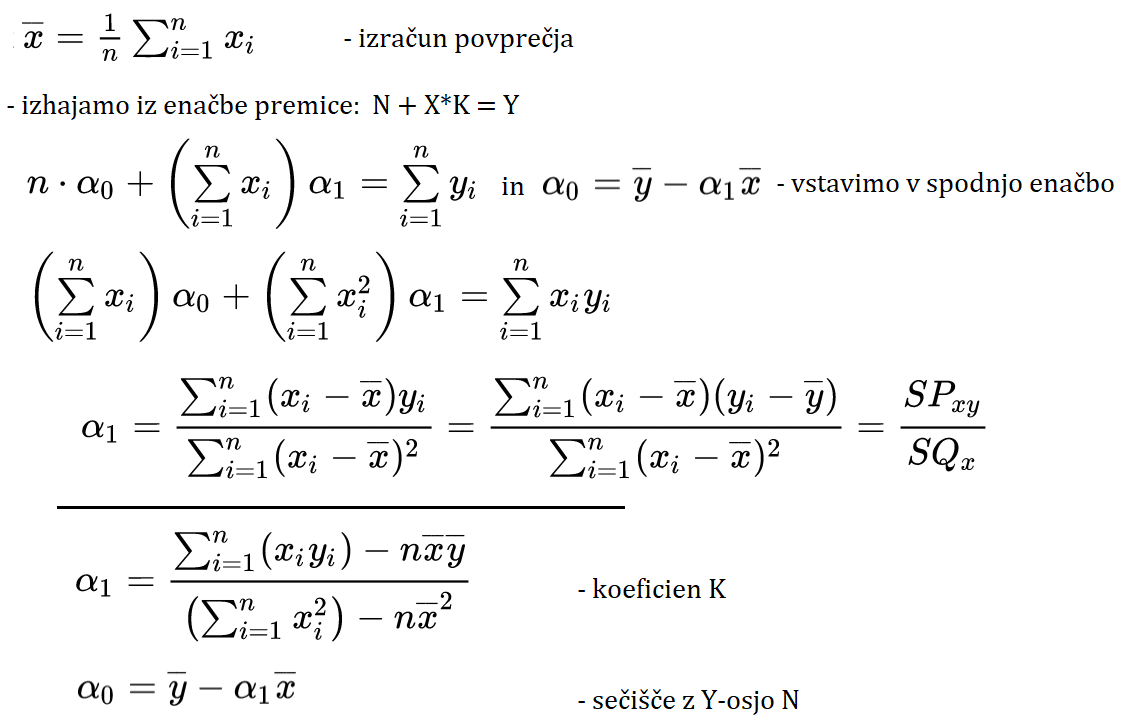 Izračunamo korelacijo, naklon K in N presečišče Y osi premice: