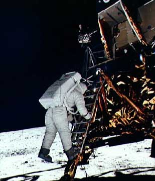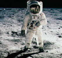 leap for mankind.).' Armstrongu je kmalu sledil še Edwin Aldrin.