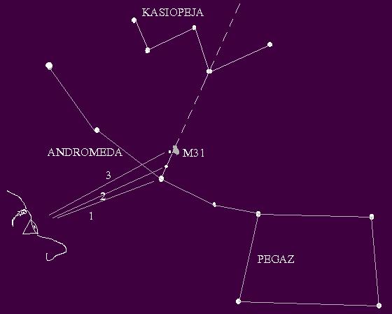 Skica ozvezdij Kasiopeja, Pegaz in Andromeda, s katero si pomagajte pri iskanju nam najbližje galaksije v Andromedi M31. Uporabite navaden daljnogled in sledite skici od poti 1 do 3. M31 se kaže kot medel madež do katerega nas pripelje "premica" 3. M31 ima veliko zorno polje skoraj 3 stopinje. Lahko jo fotografirate s stojala, objektivi 50 ali več mm, čas ekspozicije okrog minute, film 200 ali več ISO.