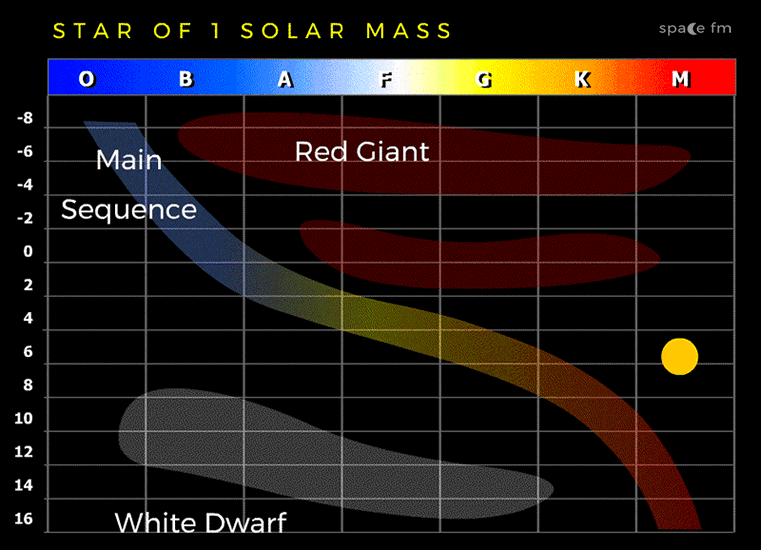 Sonce je pri vrednosti L/L☉ = 1 in spektralnem tipu G že okrog 5 milijard let