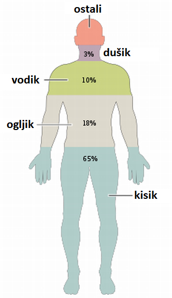 (C – 18.5 % delež v našem telesu), vodik (H – 9,5 % telesa),