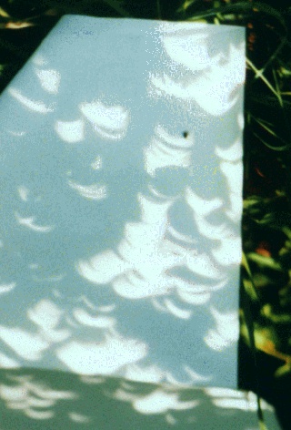 Projekcije mrka na belo podlago skozi reže listov akacije (camera obscura),