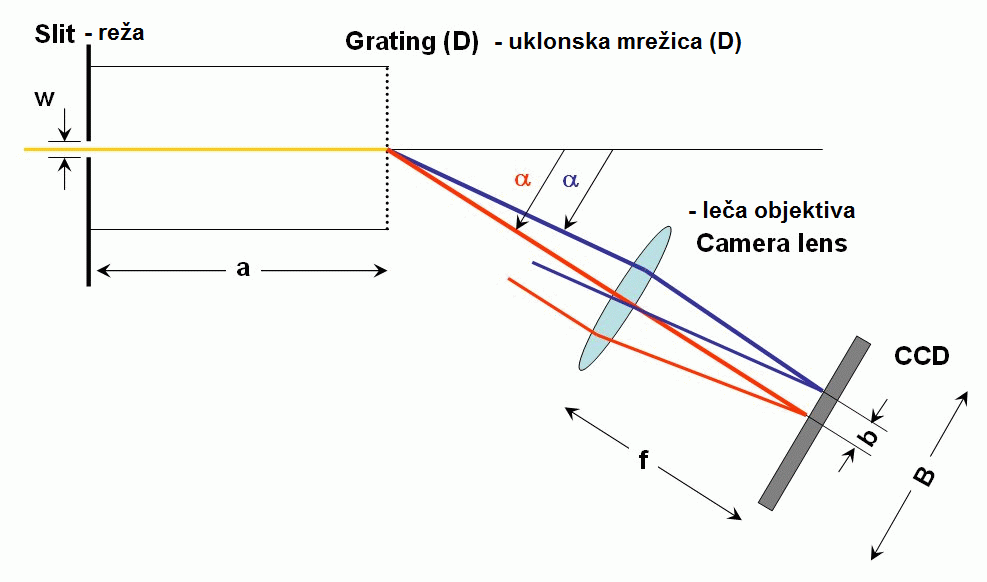 Še nekaj podatkov o skici zgoraj in osnovni izračuni dimenzioniranja spektroskopa.