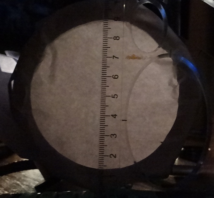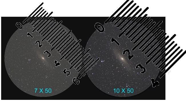 plus petkrat desetiški logaritem iz premera objektiva. Premer objektiva je podan v milimetrih, vendar se milimetri ne smejo upoštevati v računu.Primer za že navedeni teleskop (m ≈
