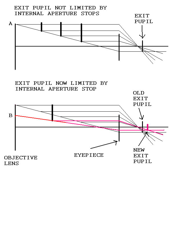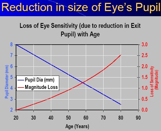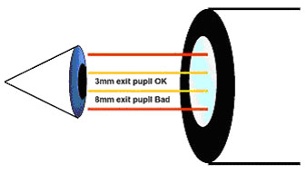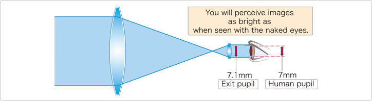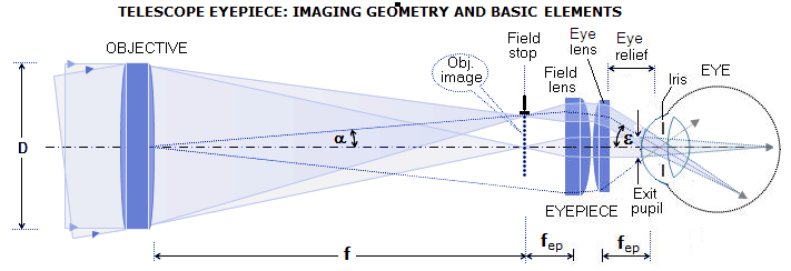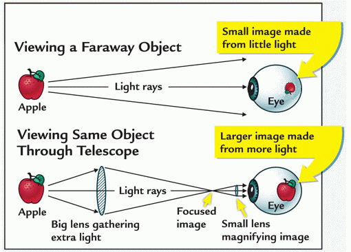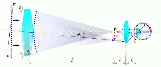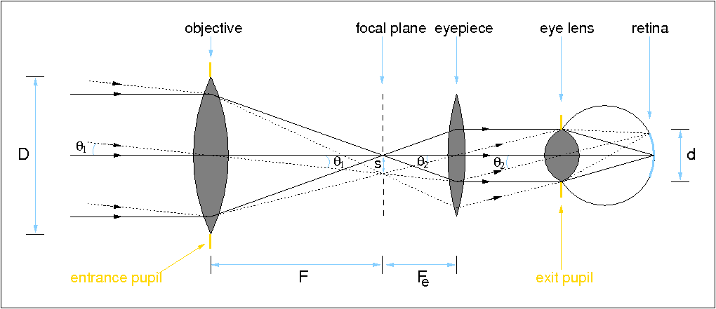 očesa=j2*Sobjektiva ali j1*d2*π/4 =j2*D2*π/4 ), to pomeni, da v teleskop prihaja tista mejna gostota energijskega toka j2 , ki se v teleskopu zgosti na j1, energijski tok pa se pri tem ohranja (primerjava vodovodne cevi, ki se zoži, skoznjo teče enak vodni tok le hitrost se v ožjem delu poveča, v1*S1=v2*S2)-iz razmisleka sledi (D/d)2=10-2(m1-m)/5,