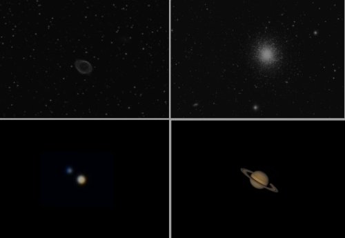 Slike objektov: M57, M13, Albireo, Saturn. Zgolj za ponazoritev podob,