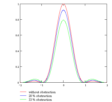 Dodatek: Koliko svetlobe se prelije iz Airyjevega diska v zunanje interferenčne obročke slike zvezde ob različnih središčnih obstrukcijah (sekundarnih zrcalih). OBSTRUKCIJA PROCENT PRENOSA SVETLOBE V UKLONSKE OBROČKE -------------------- -------------------------------------------- Ni centralne obstrukcije (o/D): 16,2% Prekrite 10% odprtine: 18,2% Prekrite 15% odprtine: 20,5% Prekrite 20% odprtine: 23,6% Prekrite 25% odprtine: 26,8% Prekrite 30% odprtine: 31,8% Problem je majhen do 15% obstrukcije, nad 30% obstrukciji pa že zelo pade kontrast, saj sosednje točke doseže že več kot 30 % uklonske svetlobe, recimo neke zvezde.![]()