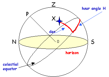 Your horizon is shown in yellow. The plane of the page (screen?) contains your meridian, the great circle containing the North, and South points on your horizon and the Zenith directly above your head. The North Celestial Pole P is the pivot around which the wheel of the stars appears to turn. When a star crosses your meridian, the Sidereal Time will exactly equal the Right Ascension of the star, so the Hour Angle (equal to ST - RA) of the star will be zero. Before that time, the hour angle is negative (or positive and larger than 12 hours) and after it is positive.