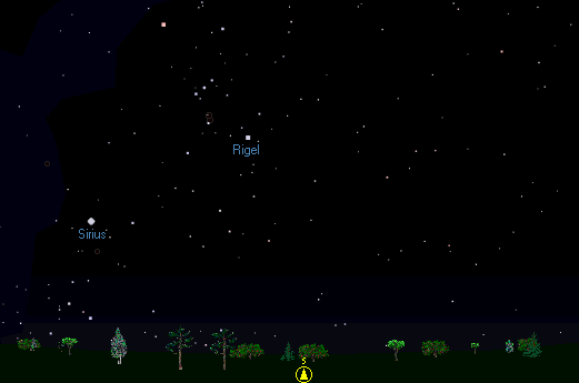 Imagine that you are looking due South at about 10:30 pm on a clear late December night in the Northern hemisphere, say around 52 degrees latitude. Just to your left, you notice the familiar shape of Orion, with Rigel as the bottom right foot of the Giant....