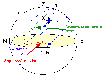 A star rises and sets when the altitude of the star is zero (we neglect refraction in these tables). Using the formulas for converting equatorial coordinates to horizon coordinates and setting altitude equal to zero, we can derive expressions for the semi-diurnal arc and amplitude...