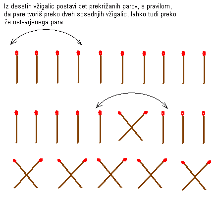 Iz desetih vžigalic postavi pet prekrižanih parov, s pravilom,