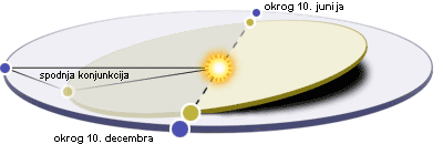 če se Zemlja in notranji planet, recimo Merkur, nahajata na presečišču obeh