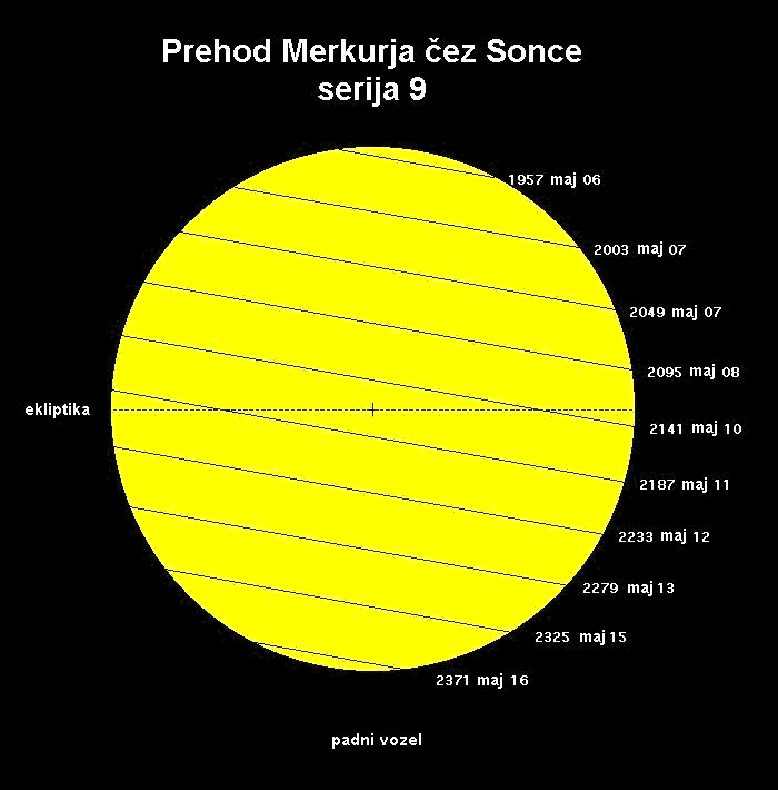 Znotraj cikla 46 let se ponavadi zgodi 6 prehodov, v bodoče se bodo dogajali prehodi z naslednjimi zamiki: 3.5, 9.5, 3.5, 13, 7, 9.5 let (skupaj 46 let). Možne so seveda tudi drugačne kombinacije, recimo (3.5, 13, 13, 3.5, 3.5, 9.5 - za obdobje maj 1707 do maj 1753). Zaradi lažjega sortiranja se prehodi razvrščajo, recimo v majske in novemberske serije, v vseh serijah je cikel dolg 46 let, glej zgornji sliki. Serije so oštevilčene glede na zaporedno kronologijo začetnega prehoda v seriji. Majski seriji št. 9 pripada tudi letošnji prehod, tako lahko rečemo, da je to začetek novega 46 letnega cikla. Majski cikli so se (ali se bodo) začeli v letih 1957, 2003, 2049, 2095, 2141, 2187 ... Vsi majski prehodi so posebni, ker se zgodijo približno mesec dni po Merkurjevem afeliju, zelo blizu minimalne hitrosti (najbližje Zemlji). Med dvema majskima 46-letnima cikloma se lega prehoda (črta prehoda) Merkurja glede na Sonce vzporedno premakne za približno 200'', glej sliko. To so kotne razdalje med "vzporednimi" črtami.