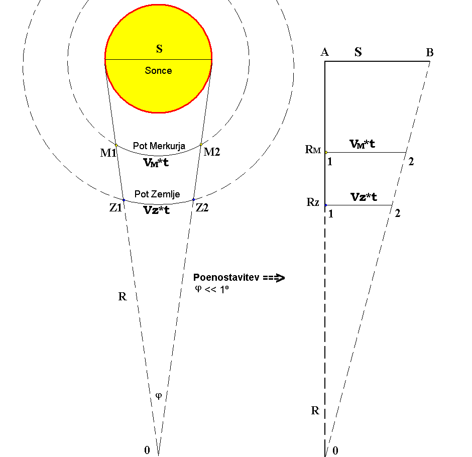 Skica poenostavitve krivega gibanja v premo. Prehod Merkurja čez Sonce