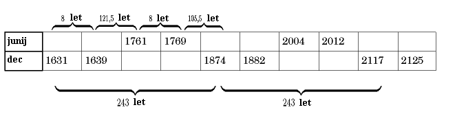 8 let + 121,5 let + 8 let + 105,5 let = 243 let 5 + 76 + 5 + 66 = 152 sinodskih period
