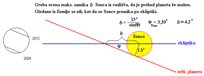 Desno, ocena maksimalnega odmika Sonca iz vozlišča, da je prehod planeta še možen,