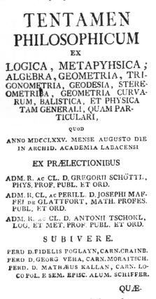Tentamen philosophicum , seznam vprašanj iz tega zaključnega izpita, je ohranjen in shranjen v Matematični knjižnici v Ljubljani.