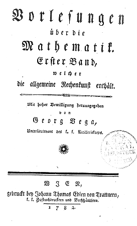 Kot učitelj matematike na topničarski šoli je Vega kmalu ugotovil, da poučujejo brez primernih knjig in brez pravega sistema, zato se je lotil pisanja učbenikov za svoj predmet. @e februarja 1782 je izdal na Dunaju prvi zvezek svojih Matematičnih predavanj z naslovom Vorlesungen ueber die Mathematik. Vseboval je osnovne računske operacije s posebnimi števili in deloma tudi algebro v približnem obsegu srednješolske snovi, brez strogega matematičnega dokazovanja in brez preveč konciznega sklepanja. Zaradi posrečene izbire snovi in zaradi njene metodične prednosti pred tovrstnimi učbeniki (preglednost, lahko razumljiva razlaga in jasna sistematika) se je knjiga hitro uveljavila tudi na drugih šolah.