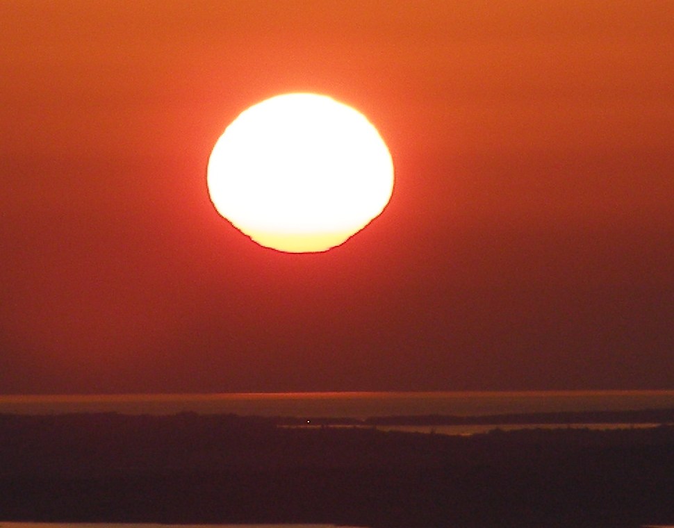 Zahoda Sonca v "morje" iz Lošinja (Televrin, Sv. Mikula 558 m nv), 27.7.2008. "Popačitev" Sonca zaradi refrakcije (loma svetlobe) v atmosferi je izrazita.