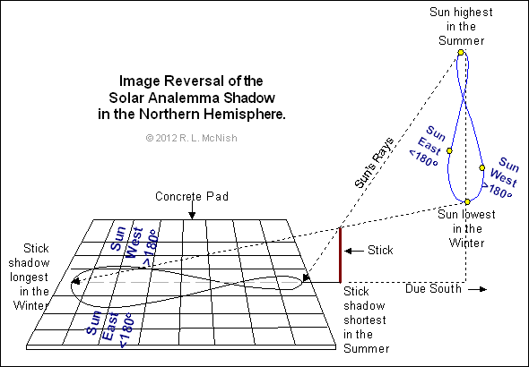 Shema logike preslikava analeme v senco na površini Zemlje preko pokončne palice (slika desno).