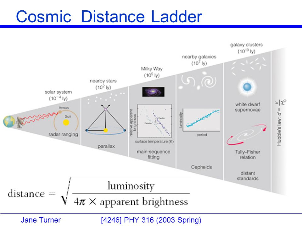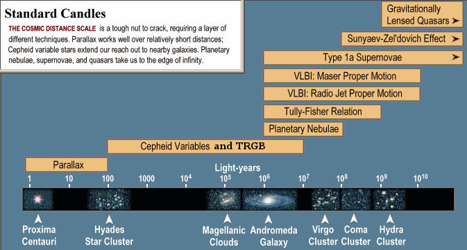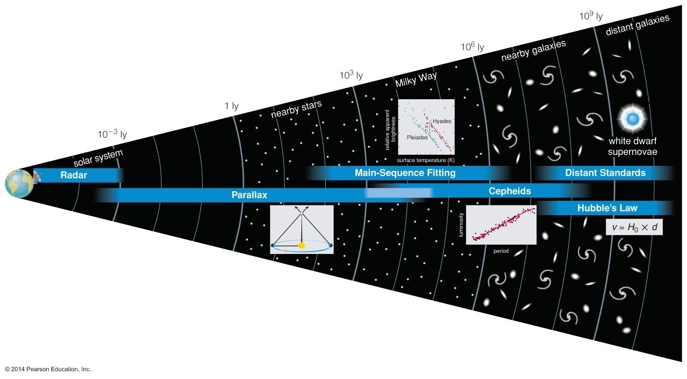 Metode merjenja razdalj v vesolju, od spodaj navzgor: