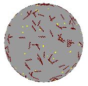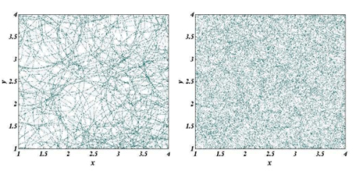 Simulacija 2D plina, ki ga zelo dobro opisuje Maxwell–Boltzmannova porazdelitev hitrosti delcev plina.