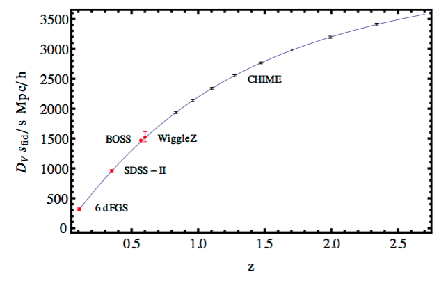 Predvidene meritve razdalje v primerjavi z rdečim premikom CHIME, ki temeljijo na BAO in ob predpostavki standardne kozmologije ΛCDM, skupaj z nekaterimi obstoječimi meritvami pri nižjih rdečih premikih.