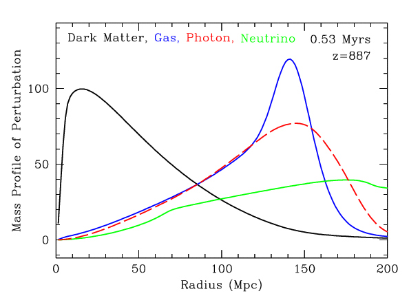 Delček animirane različica slike (Bassett & Hlozek - prvotno od Eisenstein et al. 2007). To kaže razvijajočo se motnjo sferične gostote v eni dimenziji. Upoštevajte tesno sklopitev barionske snovi (modro) in fotonov (rdeče) do premika z ~ 1100. Upoštevajte tudi, da temna snov sledi barionom z zamikom, saj ni neposredno podvržena fotonskim interakcijam.