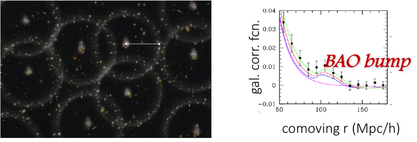Od Eisensteina et al. 2005 je BAP (Baryon Acoustic Peak) lokalni vrh v korelacijski funkciji dveh točk (v tem primeru SDSS [Sloan Digital Sky Survey] svetlih rdečih galaksij) na lestvici ~150 Mpc (~105 na tej osi x, ker je h = H0 / (100 km/s/Mpc)).