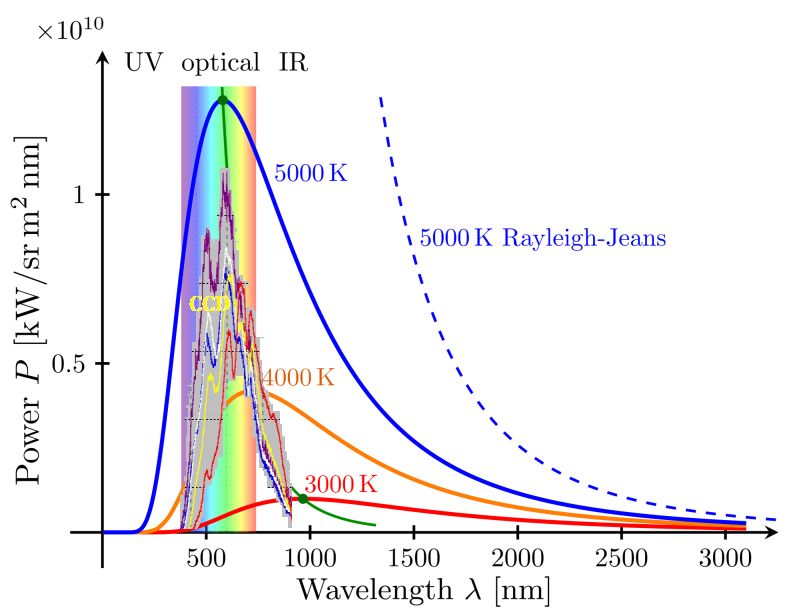 Graf zgoraj ponazarja porazdelitev gostote toplotnega izseva po valovnih dolžinah za idealna črna telesa z različnimi temperaturami. Tako porazdelitev najbolje opisuje (že omenjeni) Planckov zakon. Lege maksimumov (in pripadajoče valovne dolžine) izseva pa določa temperatura, kar opiše Wienov zakon (λ*T=2897Kµm). Danes Stefanov zakon o sevanju črnega telesa (j = σT4) izpeljujemo iz Planckovega zakona. Spektralna gostota (po valovnih dolžinah) črnega telesa je po Planckovem zakonu enaka: