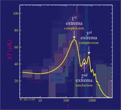 Razmislite zdaj o sferičnem zvočnem valovanju, ki se širi iz te prevelike gostote. Temna snov ostaja izvor prevelike gostote, saj medsebojno deluje le prek gravitacijskih sil, vendar sami barioni in fotoni se potiskajo navzven z neko hitrostjo zvoka, ki je blizu polovice svetlobne hitrosti (Peebles). Ko so se fotoni ločili od snovi (v obdobju zadnjega sipanja), je sila pritiska v bistvu padla na 0 zaradi pomanjkanja interakcij med fotoni in snovjo. To pomanjkanje pritiska je barionom ustavilo nadaljnje širjenje navzven, in ta razdalja med prvotnim mestom večje gostote in efektivnim obročem barionov se imenuje "zvočni horizont" (tudi "kozmični mehur"). Med največjim stiskanjem (ali redčenjem) v potencialnih lijakih dosežejo gostotne ekstreme. Po rekombinaciji je ta slika zamrznjena in ti načini bodo ustrezali vrhom spektra moči CMB, saj bodo imeli ti predeli nekoliko povečano temperaturo. (Slika: Wayne Hu)