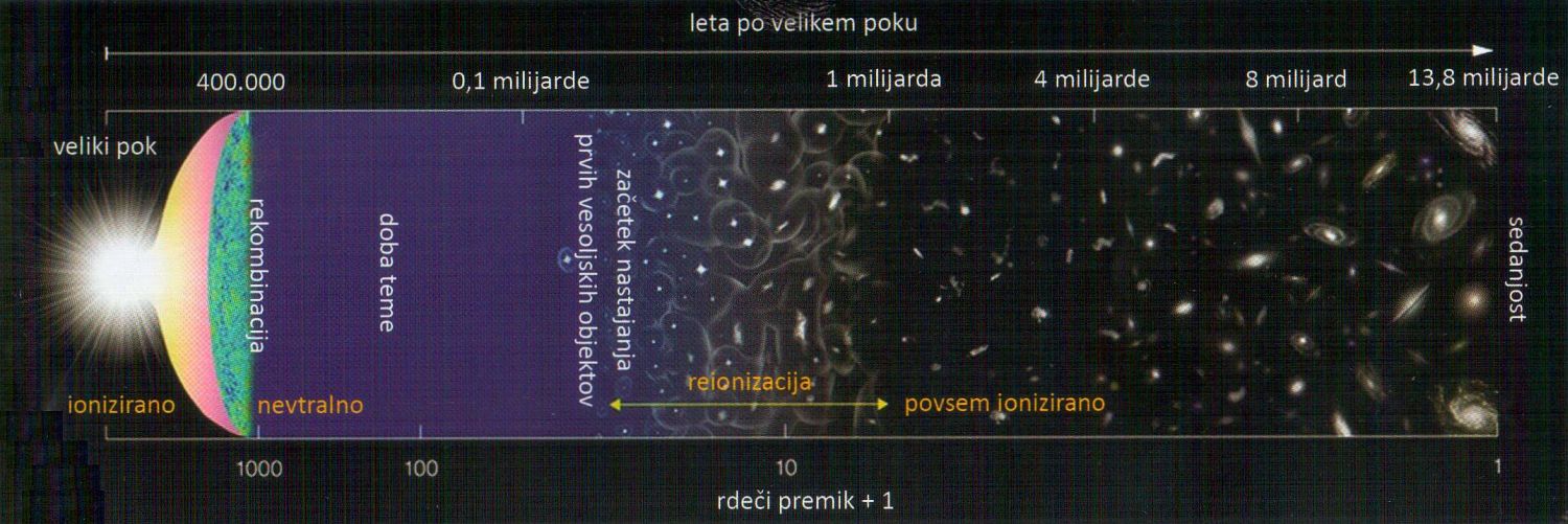 Približno 400.000 let po velikem poku je imela snov v vesolju obliko gostega, skoraj enakomernega morja izredno vroče plazme z elektroni, ki so imeli preveč energije, da bi se združili skupaj z atomskimi jedri v "nevtralne" atome. Rahla nihanja gostote (približno en del na 100.000) v tem morju so povzročila, da je privlačna gravitacija poskušala združiti snov v večje žepe zgoščenin.