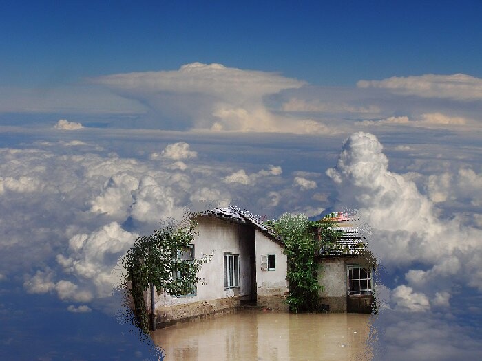 Mimo hiše so, kot v sanjah, plavali različni predmeti. Smetnjaki, mize, stoli,