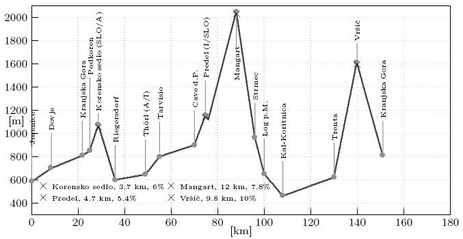 Razdalja 151.5 km, vzpon 3040 m, čas kolesarjenja 8 ur 49 minut, čas s