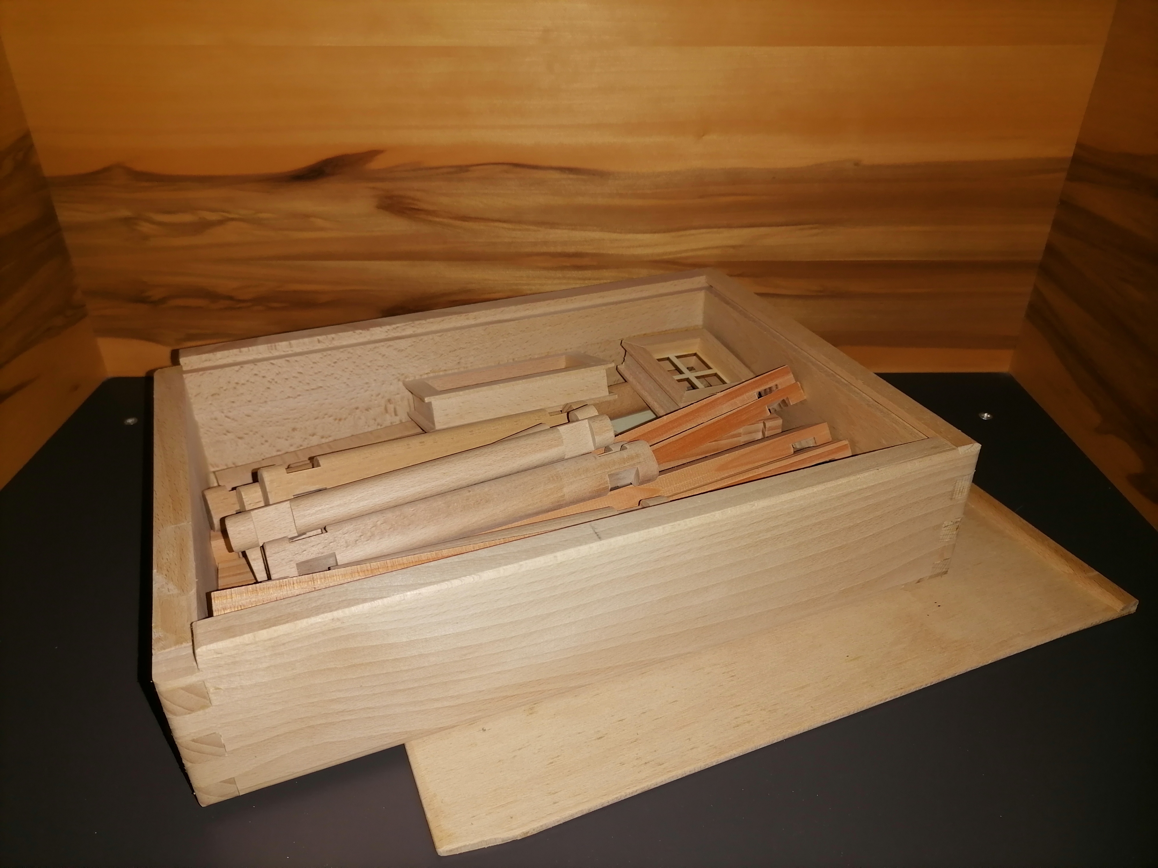 Za hrenjenje vseh delčkov in komponent lahko izdelamo tudi škatlo za hranjenje. Tudi ta je iz masivnega lesa in brez aditivov, barv in vijakov.