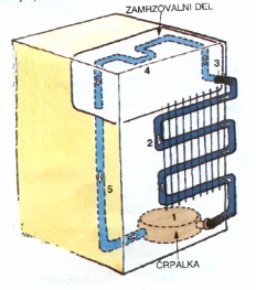 in pri tem oddaja toploto preko cevi in reber na njih v okolico.