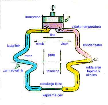 | Sledimo poti hladilnega plina po ceveh in poglejmo, kako hladilnik