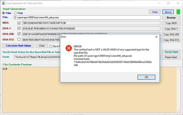If no match is found then an error dialog is shown informing you that the provided hash value does not correspond to any of the calculated hash values (Figure 4).